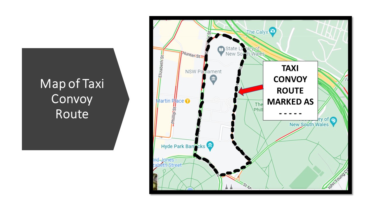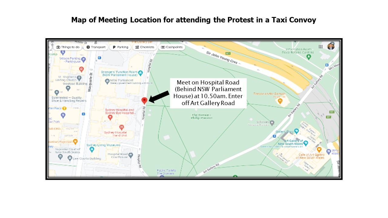 See map below for reference to the meeting location for attending the Protest in a Taxi Convoy or Click here